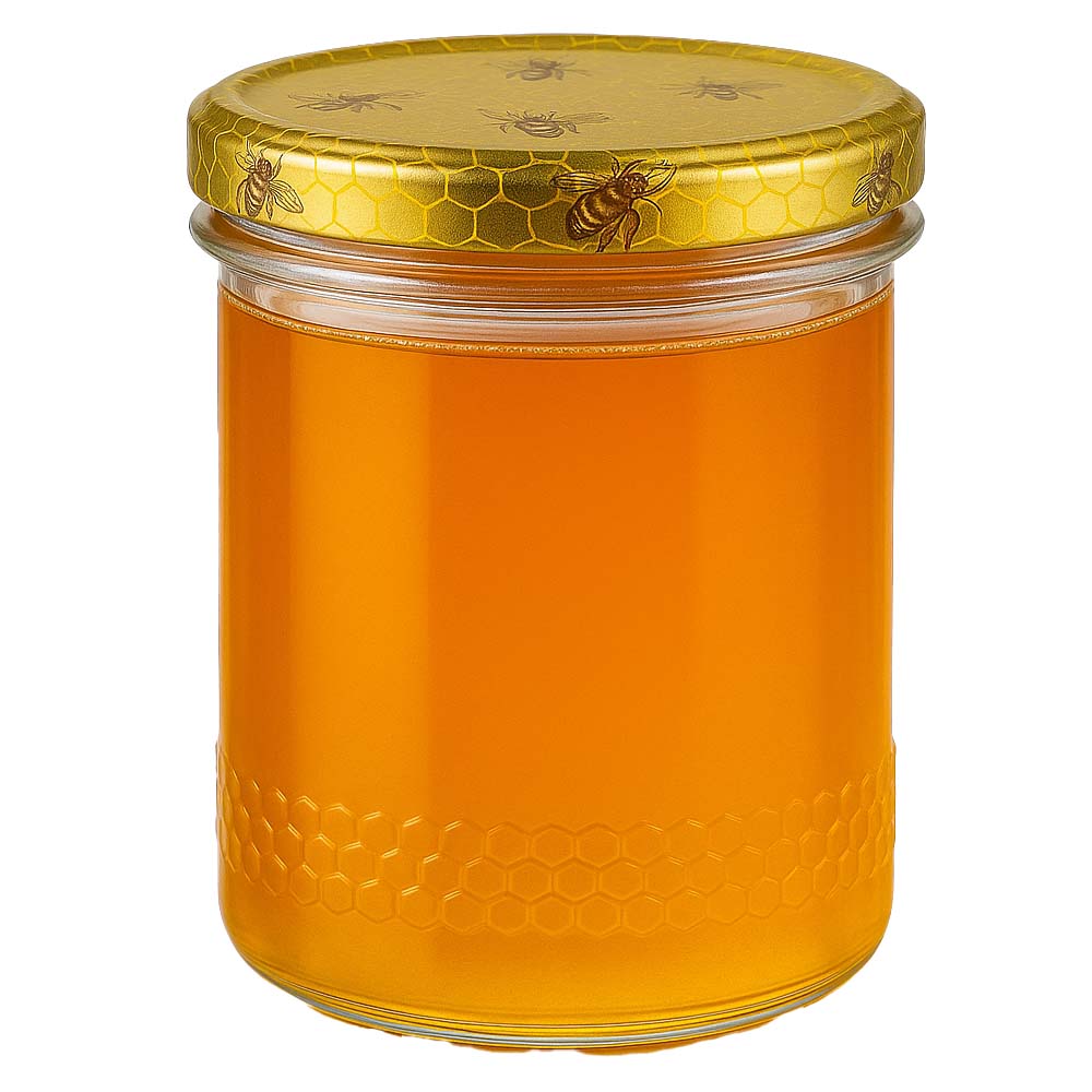 Pot à miel en verre de 560 g avec couvercle métallique orné d’un motif rayon de miel BasicSeal UNiTWIST. Le design alvéolé met en valeur l’authenticité du miel et convient aux ventes directes ou aux coffrets cadeaux.